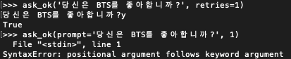 ask_ok('당신은 BTS를 좋아합니까?') - default 값이 있는 인자 하나에만 값을 전달하는 법