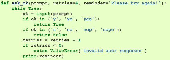 위 함수는 prompt에 질문을 받은 후에 유저로부터 입력을 받고 입력 값에 따라 적절한 값이 포함되어 있지 않으면 reminder를 출력해주고 retries횟수만큼 prompt질문을 다시 묻고 포함되어 있다면 True 또는 False를 return 하는 함수이다.